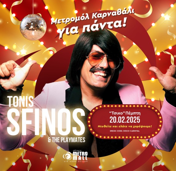 Ο αγαπημένος τραγουδιστής και περφόρμερ Tonis Sfinos, μια περσόνα που αγαπήθηκε πολύ από το κοινό, καθώς έγινε δημοφιλής μέσα από τα εντυπωσιακά χορευτικά και τις φιγούρες που απέπνεαν την εποχή των 60s και των 70s, θα ανέβει στη μουσική σκηνή του ATHENS METRO MALL για ένα live party που θα ξεσηκώσει μικρούς και μεγάλους!
