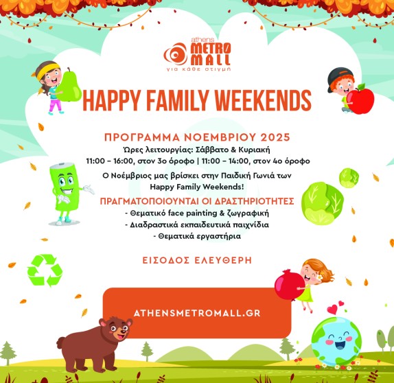 Ο Νοέμβριος μας βρίσκει στην αγαπημένη μας γωνιά των Happy Family Weekends με πολλές εκπλήξεις, δημιουργικές δραστηριότητες και μοναδικά παιχνίδια!