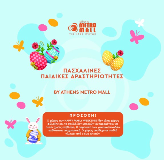 Όλοι μαζί φτιάχνουμε εντυπωσιακές πλαστελινοκατασκευές, ξύλινες λαγο-δημιουργίες και λαγουδο-κατασκευές, ενώ το “Easter Bunny Face Painting” μας χαρίζει χρώμα και φαντασία. Ακόμα, συμμετέχουμε σε διασκεδαστικά παιχνίδια δράσης, πασχαλινοδρομίες με αστείες αμφιέσεις και παίζουμε το συναρπαστικό παιχνίδι «λαγουδο-στόχος»!