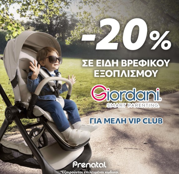 από 04.03 έως 31.03Spring offer στην Prénatal: -20% σε είδη βρεφικού εξοπλισμού Giordani, αποκλειστικά για τα μέλη VIP Club! Από καρότσια και καθίσματα αυτοκινήτου μέχρι βασικά είδη που συνδυάζουν ασφάλεια, άνεση και στυλ, τα Giordani κάνουν κάθε στιγμή πιο εύκολη για εσένα και το μωρό σου… σε μοναδικές τιμές!